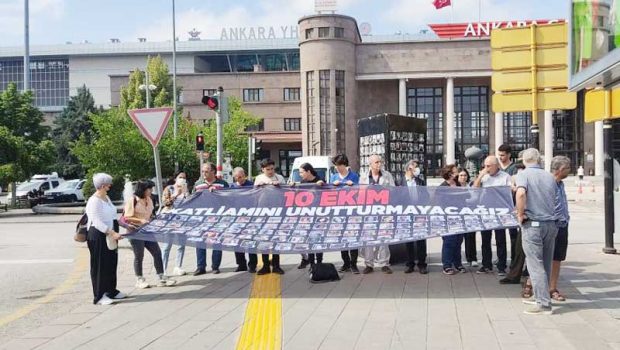10 Ekim Barış Derneği, Ankara’da 10 Ekim 2015’te gerçekleştirilen mitinge yönelik IŞİD’in bombalı saldırısında yaşamını yitiren 103 kişi için Tren Gar’ı önünde anma gerçekleştirdi. Katliamda yaşamını yitirenlerin fotoğraflarının yer aldığı pankartın taşındığı anma, katliamın gerçekleştiği saat 10.04’de yapılan saygı duruşuyla başladı. Sık sık “10 Ekim’i unutma, unutturma”, “Savaşa hayır, barış hemen şimdi”, “Suruç için adalet, herkes için adalet” sloganlarının atıldığı anmada, açıklamayı 10 Ekim Barış Derneği yönetiminden İshak Kocabıyık yaptı.