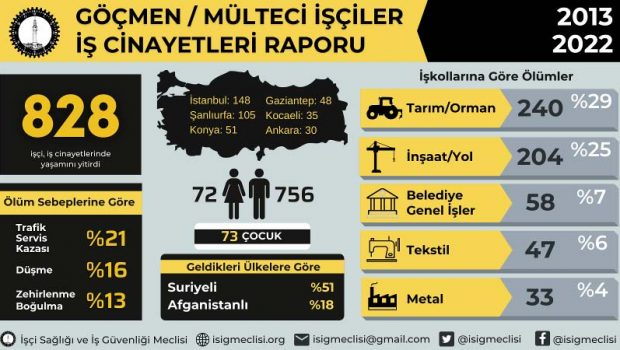 İşçi Sağlığı ve İş Güvenliği (İSİG) Meclisi, 18 Aralık Uluslararası Göçmenler Günü dolayısıyla hazırladığı raporu açıkladı. Raporda, son 10 yılda en az 828 göçmen/mülteci işçinin iş cinayetlerinde katledildiğine işaret edildi. “Bizleri yoksullaştıran, işsizliğe neden olan patronlardır ve iktidar politikalarıdır” denilen raporda, şu tespitlere yer verildi: