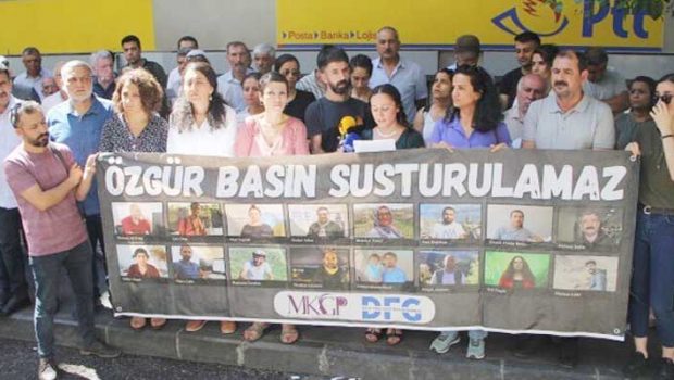 Dicle Fırat Gazeteciler Derneği (DFG) ile Mezopotamya Kadın Gazeteciler Platformu (MKGP) üyeleri, Diyarbakır’da yapılan ev baskınlarında 8 Haziran’da gözaltına alınıp 16 Haziran’da tutuklanan 16 gazeteci için Diyarbakır, Van ve Mersin’de açıklama yaptı. Gazetecilere, kart, mektup ve kitap gönderildi.