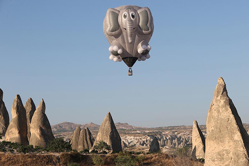 “Kurbağa”, “fil”, “kaplumbağa, “roket”, “kalp”, “kurt”, yer değirmeni” gibi 60 figürlü balon Göreme beldesinden kalkış yaptıktan sonra vadiler üzerinde yaklaşık 45 dakika boyunca uçtu.