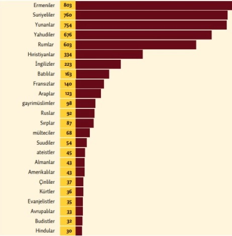 Yeni Akit’teki nefret söyleminde Hıristiyanlar ilk sırada yer aldı. Yeniçağ’da ise ilk sırayı geçen yılki gibi Yunanlar aldı. Diriliş Postası’nda ise Yahudiler ve Yunanlar ilk sırayı paylaşıyor.