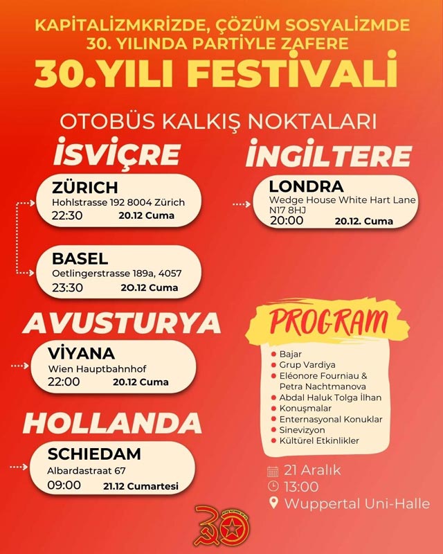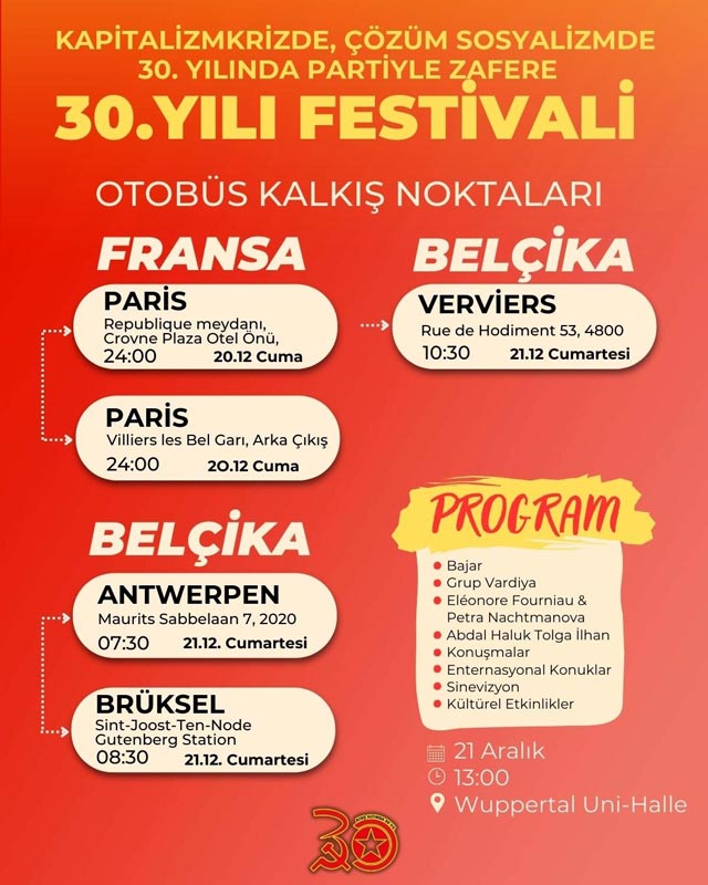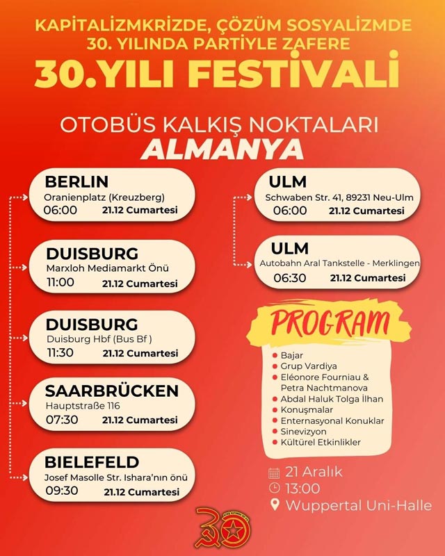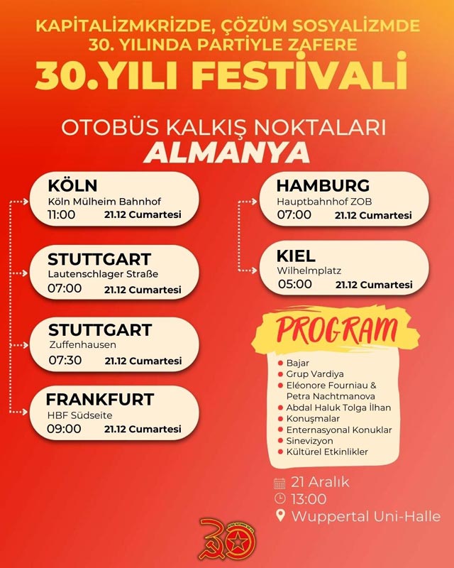 “Kapitalizm krizde, çözüm sosyalizmde! 30. Yılında partiyle zafere!” şiarıyla gerçekleştirilecek olan festivale sayılı günler kaldı. 21 Aralık’ta Almanya’nın Wuppertal kentinde gerçekleştirilecek olan festivale ilişkin son bir çağrı yapan Festival Komitesi, tüm yerli-göçmen işçi ve emekçileri festivale katılmaya davet etti. Yapılan çağrının tam metni şöyle: