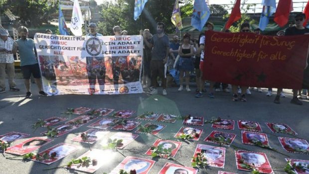 Almanya’nın Ulm kentinde Avrupa Demokratik Güç Birliği’nin (ADGB) çağrısıyla bir anma mitingi düzenlendi. Ulm Eisstein Anıtı önünde yapılan etkinlikte, ADGB, AVEG-KON, FED-GEL ve ATİF adına yapılan Almanca ve Türkçe konuşmalarda, “Katliam lanetlenirken, sorumluların yargılanmadığı, bu anlamda Suruç için adalet herkes için adalet talebimizi her yerde haykırıyoruz” diyen konuşmacılar, mücadeleye devam edecekleri mesajı verdiler. (MA)