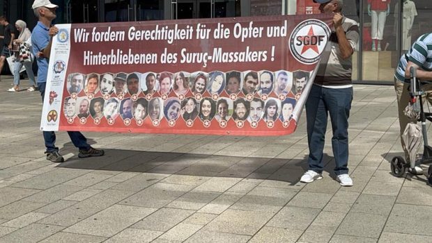Eylemde, Almanca ve Türkçe, “Suruç şehitleri ölümsüzdür”, “Suruç için adalet, herkes için adalet” sloganları atıldı.