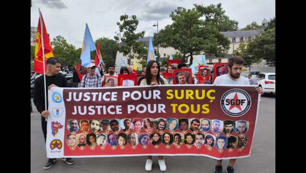 20 Temmuz Perşembe akşamı saat 18:00 de Paris Gare de L’est önünde bir araya gelen kitle, Suruç katliamında ölümsüzleşen devrimcilerin fotoğraflarını ve “Suruç için adalet, herkes için adalet” sloganın yazılı olduğu pankartı taşındı.