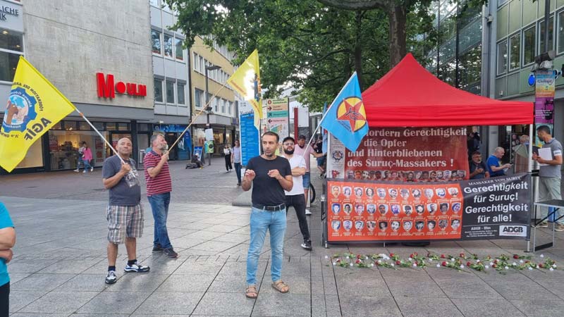 Suruç katliamının 8.yılında 20 Temmuz’da eş zamanlı olarak Almanya’nın başkenti Berlin, Köln, Stuttgart, Hamburg, Frankfurt, Wuppertal, Hildesheim, Dessau ve Ulm; İsviçre’nin Zürih ve Basel, İngiltere’nin başkenti Londra, Avusturya’nın başkenti Viyana ile Bregenz, Belçika’nın başkenti Brüksel, Fransa’nın başkenti Paris ve Hollanda’nın Den Haag kentlerinde düzenlenen eylemlerde Suruç şehitleri anıldı, sömürgeci faşist Türk devleti ve faşist terör örgütü IŞİD lanetlendi.