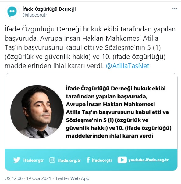 İfade Özgürlüğü Derneği hukuk ekibi tarafından yapılan başvuruda, Avrupa İnsan Hakları Mahkemesi Atilla Taş’ın başvurusunu kabul etti. Karar göre sözleşmenin “özgürlük ve güvenlik hakkı” ile “ifade özgürlüğü” maddeleri ihalal edildi.