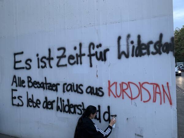 Jinên Xwendekarên Kurdistan (JXK) üyeleri, İsviçre’nin Basel kentinde bir eylem daha gerçekleştirdi. Aktivistler, Yekîtiya Xwendekarên Kurdistan (YXK) ve enternasyonalistlerle birlikte Türkiye ile İsviçre arasında yürürlüğe giren serbest ticaret anlaşmasını protesto etmek için Basel’de bulunan Novartis binasını ablukaya aldıktan ve eylemlerini sonlandırdıktan sonra kent duvarlarına yazılama yaptı.