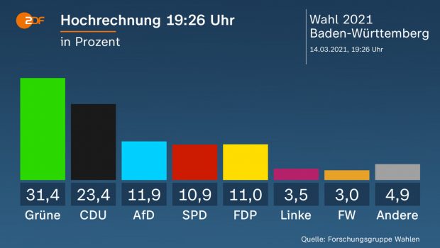 Almanya’nın Baden-Württemberg Eyalet Meclisi seçiminde Yeşiller yüzde 31 oranında oy olarak birinci çıkarken, Rheinland-Pfalz Eyalet Meclisi seçiminden ise Sosyal Demokrat Parti (SPD) yüzde 34,5 oy oranıyla birinci oldu.