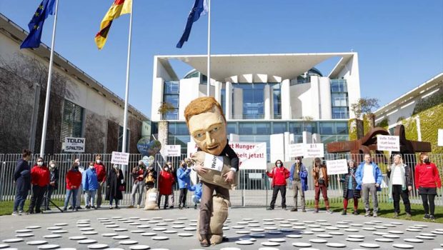 Ellerinde pankartlar ve Maliye Bakanı Christian Lindner’i temsil eden şişme balon ile Başbakanlık önünde toplanan göstericiler, Ukrayna-Rusya Savaşı’nın dünyayı bir kıtlığa sürükleyebileceği uyarısında bulunarak hükümetin gıda güvenliği konusunda sağlam adımlar atmasını istedi.