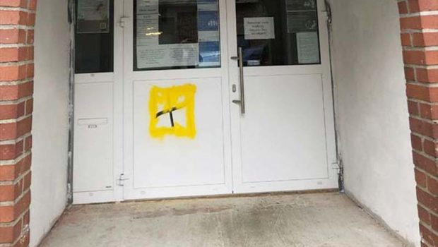 Camide incelemede bulunan polis, gamalı haçı sprey boya sıkarak kapattı.