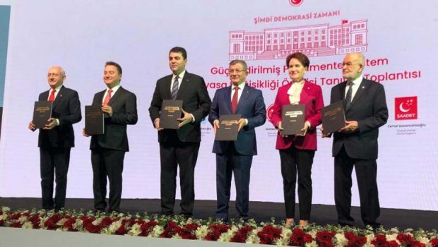 Altı siyasi parti genel başkanının bir araya geldiği altılı masa, Güçlendirilmiş Parlamenter Sistem Anayasa Değişikliği önerisini tanıtım toplantısı ile duyurdu. CHP Genel Başkanı Kemal Kılıçdaroğlu, İYİ Parti Genel Başkanı Meral Akşener, DEVA Partisi Genel Başkanı Ali Babacan, Gelecek Partisi Genel Başkanı Ahmet Davutoğlu, Saadet Partisi Genel Başkanı Temel Karamollaoğlu ve Demokrat Parti Genel Başkanı Gültekin Uysal’ın bir araya geldiği altılı masa; Güçlendirilmiş Parlamenter Sistem Anayasa Değişikliği Önerisi tanıtım toplantısını, Ankara Bilkent Otel’de gerçekleştirdi.