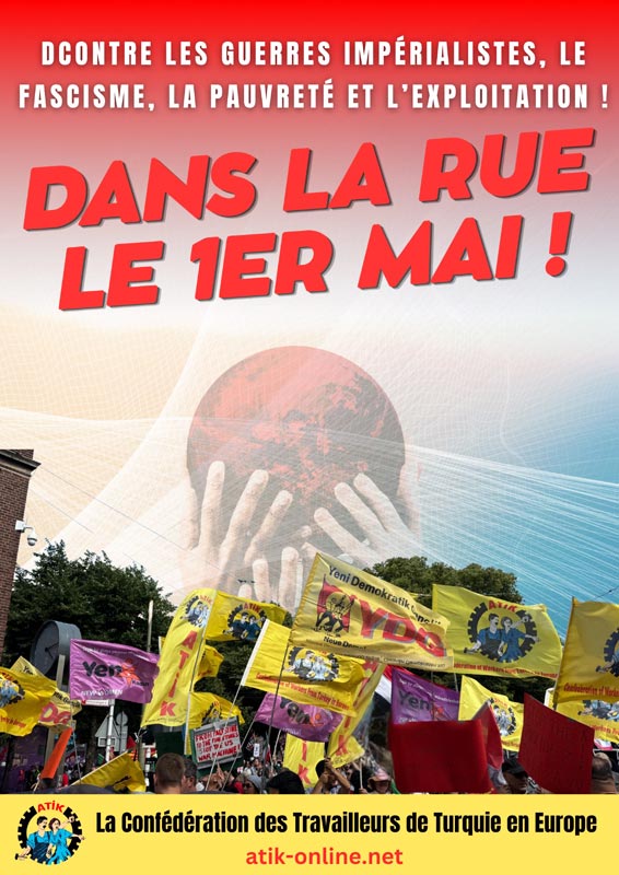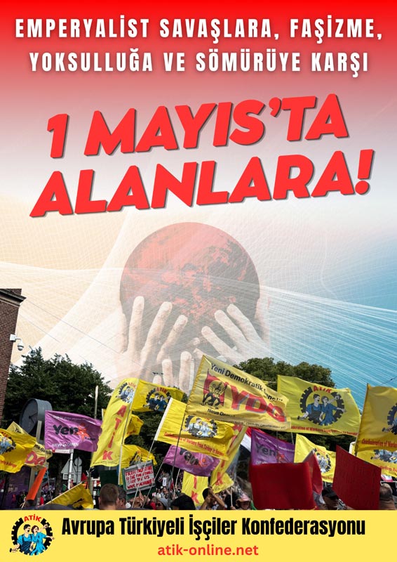 Avrupa Türkiyeli İşçiler Konfederasyonu (ATİK), 1 Mayıs İşçi Bayramı öncesinde yayımladığı açıklamayla işçi sınıfını alanlara çıkmaya çağırdı. Açıklamada, dünya genelinde artan emperyalist savaşların ve ekonomik krizlerin faturasının emekçilere kesilmek istendiği belirtilerek, “Bu faturayı biz ödemeyeceğiz” denildi.