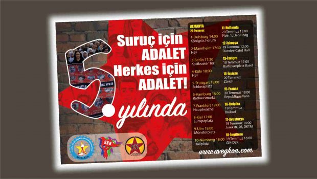 Sorumluların yargılanması talepli Suruç şehit ailelerinin ve yoldaşlarının başlattığı adalet mücadelesi ve kabına sığmaz öfke, Saray rejiminin her türlü çabasına rağmen 5 yıldır durmadı. “Suruç İçin Adalet, Herkes İçin Adalet” sloganı Türkiye ve Kürdistan’ın dört bir yanında yankılanmaya devam etti.