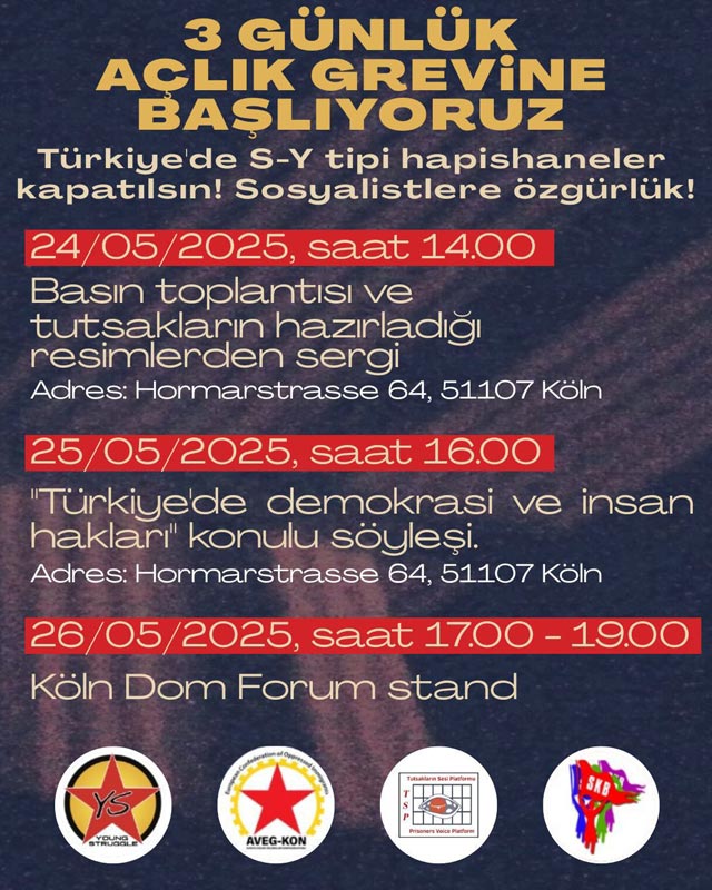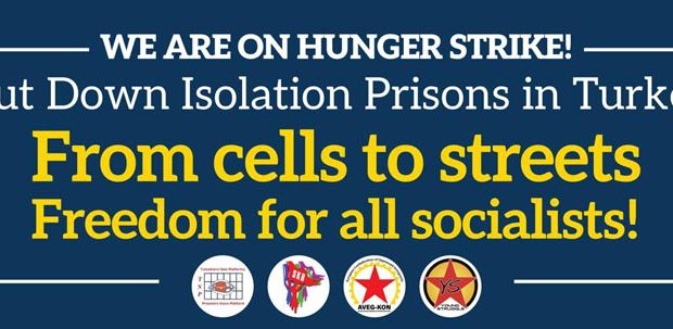 AVEG-KON, SKB, YS ve TSP olarak, Süresiz Açlık Grevi eyleminde olan sosyalist tutsakların taleplerini destekliyoruz. Sosyalist tutsaklarla dayanışmak amacıyla Avrupa’nın değişik kentlerinde 3’er günlük Açlık Grevi eylemleri gerçekleştiriyoruz.