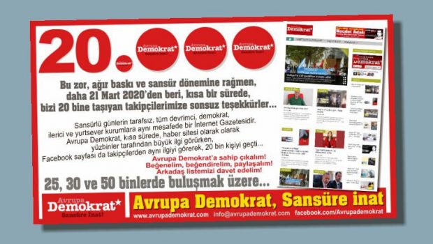 “Sansüre inat” mottosuyla 21 Mart 2020’de yayın hayatına başlayan Avrupa Demokrat’ın internet haber sitesi kısa sürede yüz binler tarafından büyük ilgi görürken, facebook sayfası olarak da takipçilerden aynı ilgiyi görerek, 20 bin kişiyi geçti…