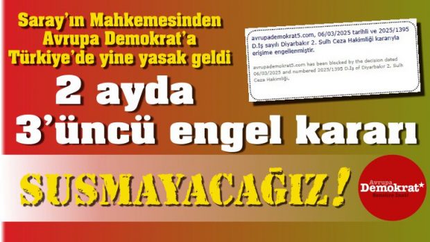 Avrupa Demokrat web sitesi ekranına, Saray’a çalışan Bilgi Teknolojileri ve İletişim Kurumu (BTK)’nın isteğiyle “avrupademokrat5.com, 06/03/2025 tarihli ve 2025/1395 D.İş sayılı Diyarbakır 2. Sulh Ceza Hakimliği kararıyla erişime engellenmiştir.” notu geliyor. Bu not bile sürekli gelmiyor ve okur ne olduğunu anlayamıyor. Sansürcüler, her zaman olduğu gibi, adrese tebliğ etmeyi bile gerekli görmüyor.