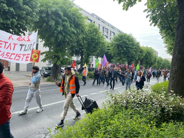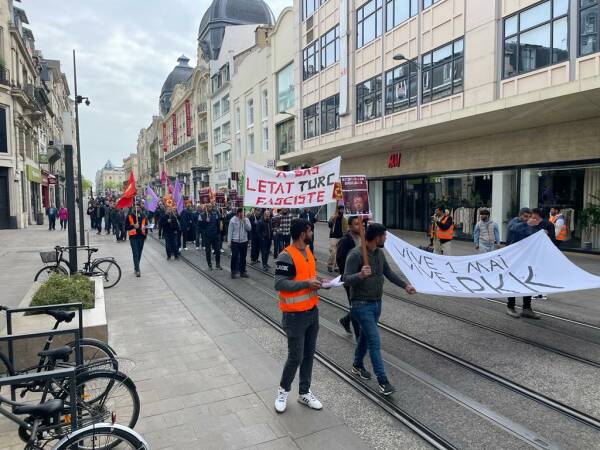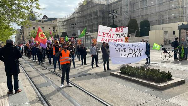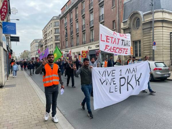 Kürdistanlılar, sabahın erken saatlerinde kortejler halinde 1 Mayıs’ın kutlanacağı Boulevard de la Paix Meydanı’na gelmeye başladı. Burada “A bas l’état turc fasciste” ve “Vive le 1. Mai”, “Vive le PKK” pankartları açıldı.
