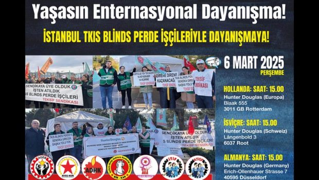 Hollanda merkezli HUNTER DOUGLOS firması 30 Ekim 2024 tarihinden bu yana İstanbul’da bulunan TKIS BLİNDS Perde işçilerinin, başta sendikal hak olmak üzere tüm anayasal ve demokratik örgütlenme haklarına yönelik saldırıları nedeniyle Avrupa’da dayanışma eylemleri gerçekleştirilecek.