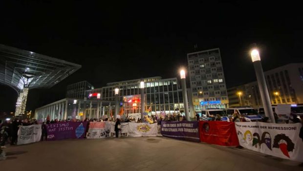 Berlin Enternasyonal ittifakı ‘’Sessizliği boz-Sistemi yık’’, ‘’Kendini savun- Ataerkil sisteme karşı savaş’’ pankartlarıyla sokaklarda erkek-devlet şiddetine karşı özgürlük sesini yükselttiler.