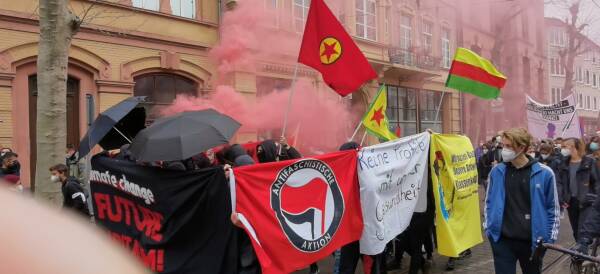 Eylemde YPG ve Antifa bayraklarının yanı sıra Almanya’da keyfi kanunlarla yasaklanan PKK bayrağı da taşındı. Gençler renkli dumanlarla eylemlerine görsellik kattı.