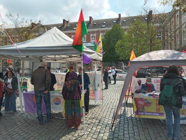 Eylem alanında açılan stantta, Kürt Halk Önderi Abdullah Öcalan’ı tanıtan broşürler ve yine jineoloji kitap ve broşürleri dağıtıldı.