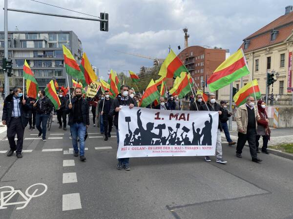 Yürüyüş boyunca sık sık “Bijî Serok APO”, “Bijî Berxwedana Gerîla”, “Es Lebe 1 May” ve “Hoch die Internationale Solidarität” sloganları atıldı.