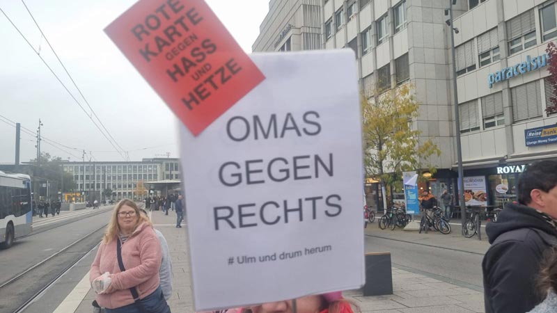 Öğleden sonra ise yaklaşık 150 kişi, Ulm’daki “Klare Kante gegen Rechts” (Sağa Karşı Net Tavır) grubunun çağrısına uyarak gösteriye katıldı. “Irkçılara kürsü yok” ya da “Mülteciler Hoş Geldiniz” yazılı pankartlar taşındı. Katılımcılar sık sık “Nazi propagandası bir hak değildir” diye slogan atarak akşamki Sellner konuşmasına atıfta bulundular.