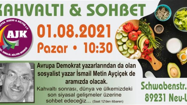 Dayanışma kahvaltısı, Schwabenstr. 41, 89231 Neu-Ulm adresinde bulunanAlmanya Göçmen İşçiler Federasyonu (AGİF) üyesi İşçi Gençlik Kültür Derneği (AJK) tarafından düzenleniyor.