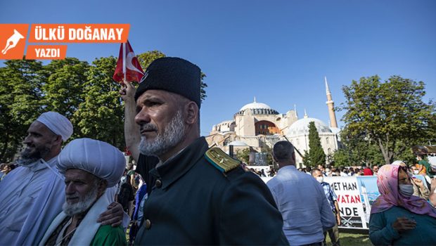 Buraya kadar yazdıklarımdan, 350 bin kişinin katılımıyla Ayasofya’da kılınan cuma namazının, yarattığı yeni imgeler ve fetih mitini canlandırma kapasitesiyle iktidar hanesine yazılan önemli bir başarı olduğu çıkarsamasında bulunacaklar olacaktır. Ancak Ayasofya’nın kısa vadede yaratmış olduğu bu heyecanın, krizle, işsizlikle ve salgınla boğuşan seçmenin, özellikle de genç seçmenin dünyasında bir karşılığının olup olmadığını iyi değerlendirmek lazım. Bir de kapaktaki fotoğrafın bize söyledikleri var: Müsamere, ister kostümlü, ister kılıçlı, yine de müsameredir.