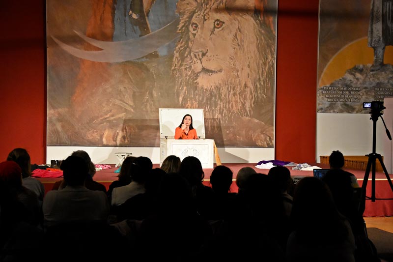Gerçek bir yaşam öyküsünden uyarlanan ve tiyatro sanatçısı Aysel Yıldırım tarafından oynanan ‘Bir Kadın Uyanıyor’ adlı oyun Cemevi Ana salonunda dün akşam saatlerinde sahnelendi. Oyun öncesi Katledilen kadınlar için bir dakikalık saygı duruşu gerçekleşti. Saygı duruşunun ardından ise selamlama konuşmalarını Kadınlar Kurulu Başkanı Zöhre Karaman yaparken, moderatörlüğü ise Genel Sekreter Tülay Karataş yaptı.