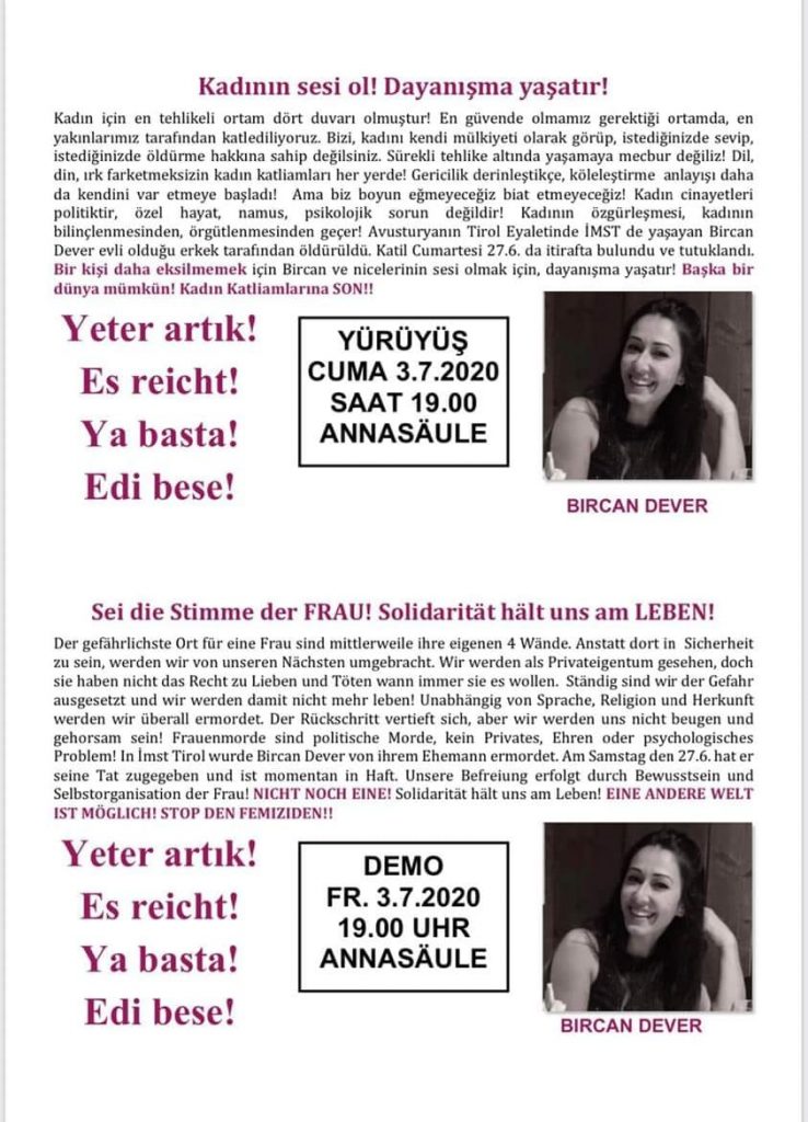 Bircan’ımızı bugün Anne Babası, ailesi, arkabları, çok sayıda aile dostu, konu komşu canlar ile birlikte bizler; Imst AKM Kadınlar Birliği, Imst PSAKD Kadınlar Birliği, AABF BW Bölge Kadınlar Birliği, Sosyalist Kadınlar Birliği, Avrupa Demokratik Kadın Hareketi ve Mor Kızıl Kollektif üyesi kadınlarla birlikt, İmst AKM‘de gerçekleşen hakka uğurlama erkanının ardından toprağa sırlanması için Kayseri’nin Develi il İlçesi’ne yolcu ettik.