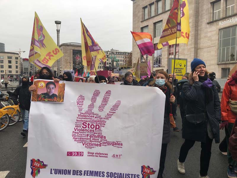 Brüksel’de 25 Kasım nedeniyle, iki ayrı eylem gerçekleṣti. İlki 25  Kasım günü Brüksel merkezi istasyonda gercekleṣti.  Meṣaleli yürüyüşte çatışmalarda yaṣamını yitiren kadınların resmi taṣındı. Kürt Kadın hareketi ve Jinoloji ‘nin birlikte  organize ettiği SKB , Iranlı kadınlar ve Belçikalı kadın örgütleri destekledi.  Yürüyüṣ  yaklaṣık 3 üç saat sürdü. Kadın örgütlerinin konu ile ilgili konuṣmalarından ve müzik dinletisinden sonra, eylem sona erdi.