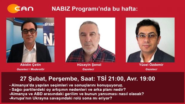 Bu akşam, Gazeteci Abidin Çetin’in moderatörlüğünde CAN TV’de NABIZ Programı’nda, Gazeteci Yücel Özdemir ve Gazeteci Hüseyin Şenol ile -Almanya seçimlerini ve sağcı partilerdeki oy artışının arka planını-Almanya/Avrupa ve ABD arasındaki gerilimin nedenlerini ve dünya siyasetine yansıması konuşulacak