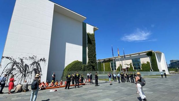 Almanya’da “Letzte Generation” (Son Nesil) adlı çevreci grup, hükümetin Kuzey Denizi’nde petrol arama planlarını protesto ederek Başbakanlık binasının dış cephesinin bir bölümünü siyah renkle boyadı.