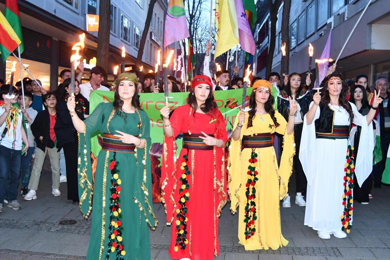 Akşama doğru Geleneksel meşaleli yürüyüşlerinin başlangıcını Friedensplatz Meydanında gerçekleştirdiler. Her yıl olduğu gibi bu yılda meşaleler ile yürüyüşe geçen Kürdistanlılar ve dostları Şehrin en işlek caddesinde geleneksel Kürt kiyafetleriyle yürüyüşe geçti. Yürüyüş boyunca Kürt müziği ve davul zurna eşliğinde yürüyen Kürdistanlılar Friedensplatz Meydanında Newroz ateşini yaktı.