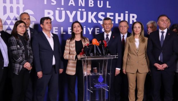 Özel’in ardından konuşan Tülay Hatimoğulları, “Siyaseten baş edemediklerine kayyım rejimiyle, gözaltı, tutuklama, diploma iptali gibi yöntemlerle yönelmek asla kabul edeceğimiz bir şey değil. Toplumsal barışı konuştuğumuz dönemde barışa, demokrasinin tesis edilmesine yönelik bir sabotaj olarak görmekteyiz, asla kabul etmeyiz etmeyeceğiz. Seçme ve seçilme hakkımızı savunmaya devam edeceğiz. Sandığı ortadan kaldırdığınızda demokrasi namına bir şey kalmaz. Türkiye dün neredeyse yüzde 3 oranında yoksullaşma yaşadı. Türkiye’nin 85 milyon yurttaşımızı geleceğini ateşe atmaktan çekinmeyenler şunu iyi bilmeli 85 milyon insan her türlü siyasi iradeden daha büyüktür. Demokrasinin, adaletin olmadığı bir yerde toplumsal barıştan bahsetmek mümkün değildir. Çağrımızı yineliyoruz herkes aklını başına alsın Türkiye’yi ekonomik, siyasi anlamda çökerten insan haklarını ortadan kaldıran, yargıyı kılıç gibi yurttaşın tepesinde sallandıran anlayışı kabul etmiyoruz. Bu darbeci anlayışı asla kabul etmiyoruz. Sayın İmamoğlu ve beraberinde gözaltında olanların bir an önce serbest bırakılmasını talep ediyoruz. Demokrasi, barış için dayanışacağız” dedi.