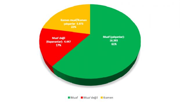 DİSK-AR, istihdamın yaklaşık yüzde 61’i (16,4 milyon) kapanmadan muaf işkollarında çalıştığını, istihdamın yaklaşık yüzde 22’si (6 milyon) kapanmadan kısmen muaf işkollarında çalıştığını belirtti.