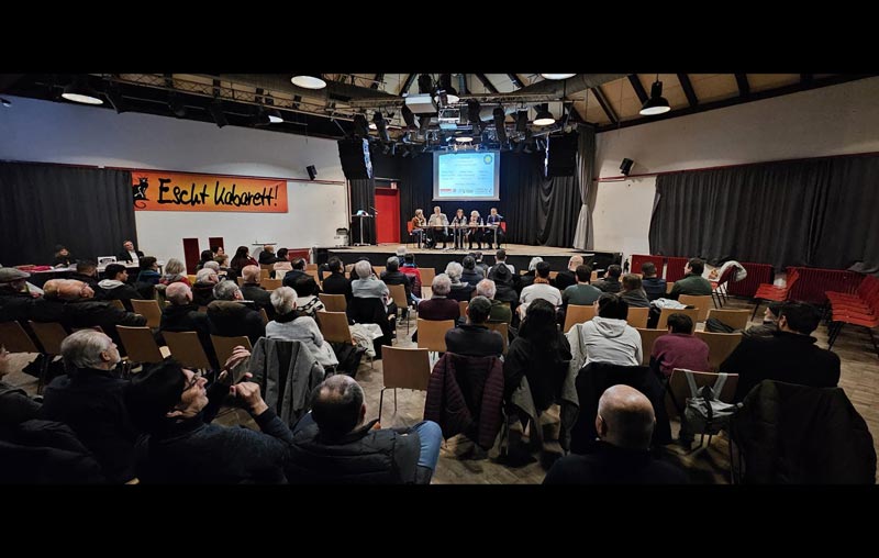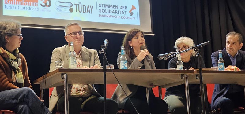 Panelde demokrasi, insan hakları ve özgürlük mücadelesi için dayanışma mesajları verildi. Etkinlik, Kinderhilfe Mesopotamien, TÜDAY, Kültürforum ve Dayanışma’nın Sesi Derneği tarafından ortak düzenlendi ve yaklaşık 80 kişi katıldı.