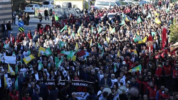 MA’nın haberine göre; “Halkın iradesi gasp edilen kayyımlara geçit vermeyeceğiz” pankartının açıldığı yürüyüşte, sık sık  “AKP halka hesap verecek”, “Jin jiyan azadi” sloganları atıldı.