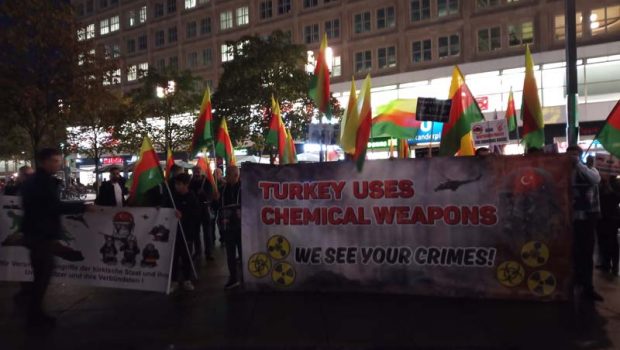 Dest-Dan Kadın Meclisi ve Nav Berlin’in çağrısı ile saat 18:00’da Alexanderplatz’da bir araya gelen Kürdistanlılar, Kobanê direnişini selamlarken, DAİŞ çetelerini Rojava’ya salan Türk devletinin gerilla alanlarına yönelik kimyasal silah saldırıları ve katliamları protesto edildi. Kimyasal silah kullanan Türk devletinin insanlık suçu işlediği belirtilerek, OPCW’nin sessiz kalması protesto edildi.