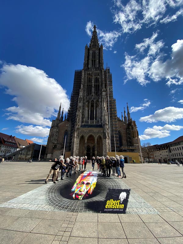 Münsterplatz’ta 3D Gösteri; Meydanın ortasına dev bir kara delik illüzyonu kurulacak! Bu özel tasarım, Ulm’lu Einstein’in yerden yükseliyormuş gibi görünmesini sağlayacak. İlk defa Lions Club Ulm Einstein da etkinliğe destek veriyor. Ünlü şef Jonas Baumgärtner, ziyaretçiler için gulaş, peynirli erişte (Käsespätzle) ve doğum günü pastası hazırlayacak. Gelir, Discovery Center’a bağışlanacak.