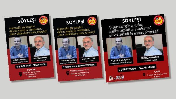 İsviçre’de Şubat 2026’da üç farklı kentte gerçekleştirilecek söyleşi etkinliklerinde Evrensel gazetesi yazarı Yusuf Karadaş ile tarihçi-yazar Erdoğan Aydın, güncel politik gelişmeleri tarihsel ve sınıfsal bağlamda ele alacak. Etkinlikler, “Emperyalist güç savaşları, dünü ve bugünü ile ‘cumhuriyet’, güncel dinamikler ve emek perspektifi” başlığıyla düzenleniyor.