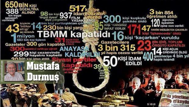 Hatırlayalım: 12 Eylül 1980 askeri darbesi sonrasındaki askeri yönetim döneminde resmi kayıtlara göre 650 bin kişi gözaltına alındı, 230 bin kişi askeri mahkemelerde yargılandı. Bu dönemde, 1 milyon 683 kişi fişlenirken, binlerce kamu görevlisi 1402 Sayılı Kanun gereğince kamu görevinden mahrum edildi. Tespit edilebilen, gözaltında ya da hapishanelerde, işkence vb. yöntemlerle ölen sayısı 229 oldu. 700 kişinin idamı istendi ve bunlardan 50’si (17 ‘si siyasi hükümlü olmak üzere) idam edildi (2).