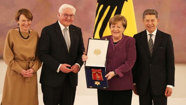 Bellevue Sarayı’nda düzenlenen törende, Cumhurbaşkanı Frank-Walter Steinmeier, Merkel’e özel tasarımla hazırlanan Federal Almanya Cumhuriyeti Liyakat Nişanı’nın Büyük Haçı’nı takdim etti.