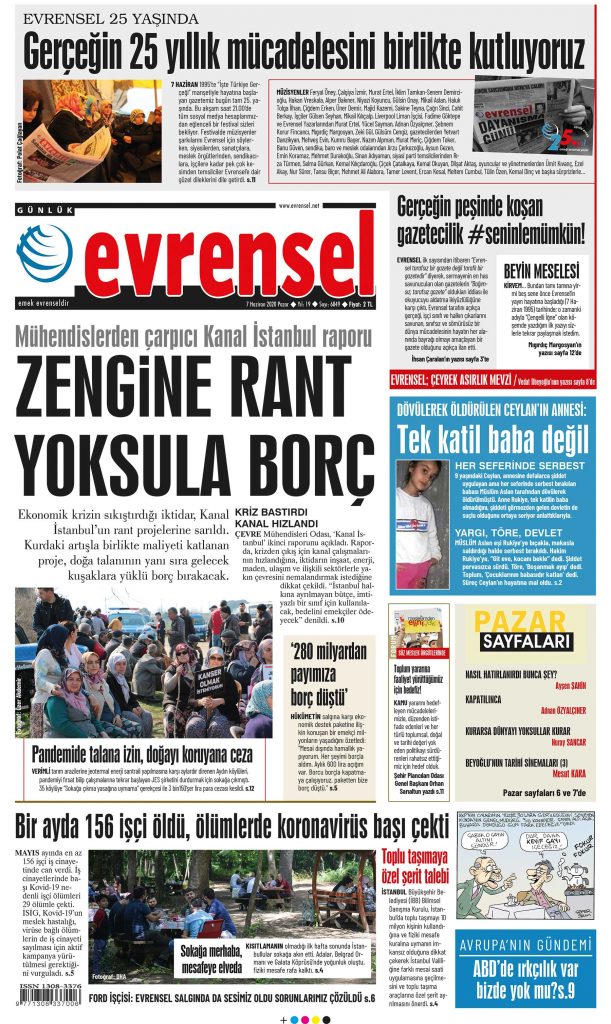 “Gerçekleri emek, emeği Evrensel yazar” şiarıyla gücünü işçi sınıfı ve emekçilerden alan Evrensel, 25 yıldır işçilerin, emekçilerin, kadınların, gençlerin, üreticilerin, köylülerin sesi olmaya ve haberleriyle gerçeğe ışık tutmaya devam ediyor.