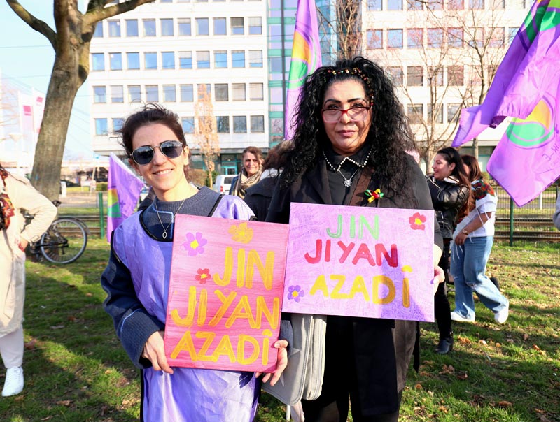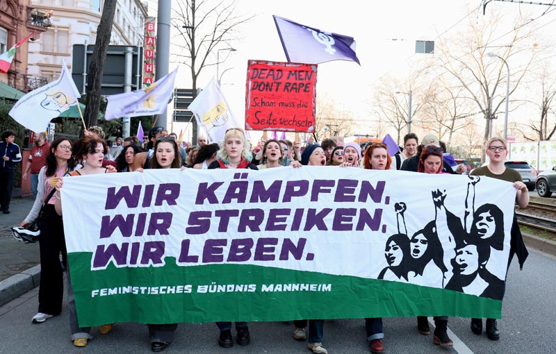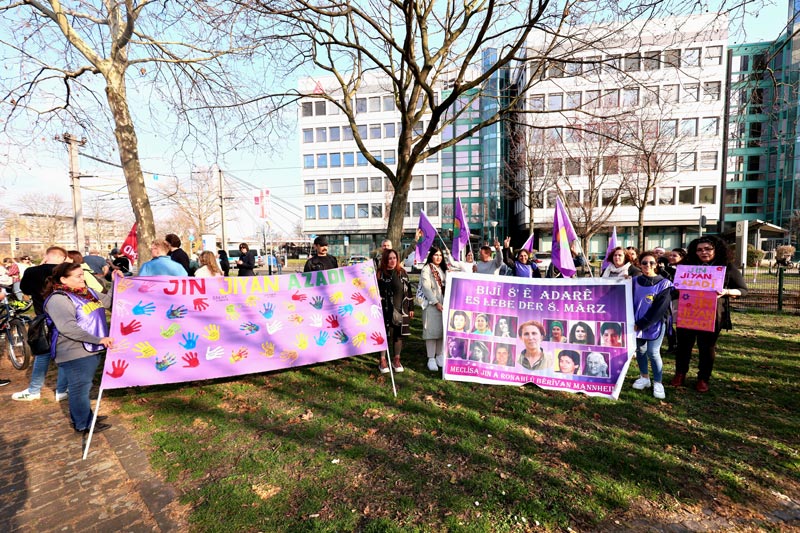 Mannheim’lı Kadın gruplarının oluşturduğu Feministisches Bundis Mannheim (Feminist Platform Mannheim), 8 Mart günü “Savaşıyoruz-Grevdeyiz-Yaşıyoruz” sloganı ve tüm cinsiyetler için eşitlik ve adalet, talepleriyle alandaydı. Mannheim Gewerkschaftshaus (Alman Sendikalar Birliği) binası önünde saat 16:00’da başlayan miting ve yürüyüş kadınların talepleriyle öne çıktı, hazırladıkları döviz bildiri ve pankartlarla alanı dolduran kadınlar, mitingin başlangıcında konuşmalar yaptıktan sonra yürüyüş gerçekleştirdiler, şehir içerisinden yaklaşık 4 kilometrelik güzergah boyunca sloganlar ve şarkılar marşlar eşliğinde, Mannheim Üniversite Meydanına kadar yürüdüler, Mannheim Üniversite Meydanında da miting yapan kadınların eylemine ilgi yoğundu, Yürüyüş güzergahı boyunca halktan olumlu tepkiler alan yürüyüşte, Jin Jiyan Azadi sloganı sıklıkla atıldı. Yürüyüş boyunca Kürtçe Almanca ve başka dillerde de şarkılar çalındı.