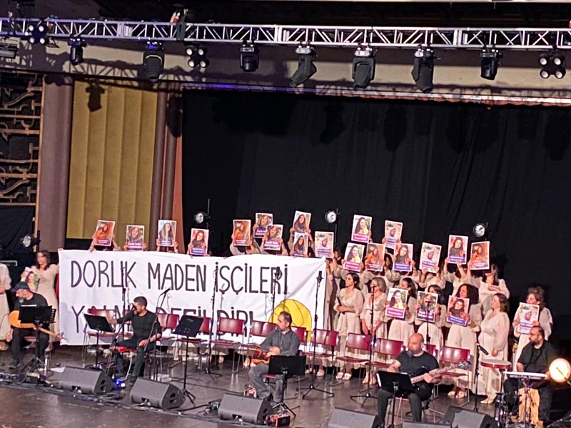 İki bölüm halinde gerçekleşen konserde sahneyi ilk olarak şef Zuhal Yıldırım Gök yönetiminde Rengin Kadın Korosu aldı. Koro kadın cinayetlerine dikkati çekmek için salona aralarında Gülistan Doku’nun da bulunduğu kayıp ya da cinayete kurban gitmiş kadınların fotoğraflarını taşıyarak girdi. Korist Handan Kırbıyık’ın okuduğu Kemal Özer’in ‘Madenciler’ şiiri eşliğinde Türkiye’de ve dünyada yaşanan işçi hakları ihlallerine vurgu yapıldı. Doruk maden işçileri ile dayanışmak için koro üyeleri tarafından açılan ‘Doruk Maden İşçileri Yalnız Değildir’ pankartı dinleyiciler tarafından alkış ve ‘Direnen işçiler Yalnız Değildir’ sloganı ile karşılandı.