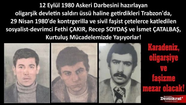 12 Eylül 1980 Askeri Darbesini hazırlayan oligarşik devletin saldırı üssü haline getirdikleri Trabzon’da, 29 Nisan 1980’de kontrgerilla ve sivil faşist çetelerce katledilen sosyalist-devrimci Fethi ÇAKIR, Recep SOYDAŞ ve İsmet ÇATALBAŞ, Kurtuluş Mücadelemizde Yaşıyorlar!