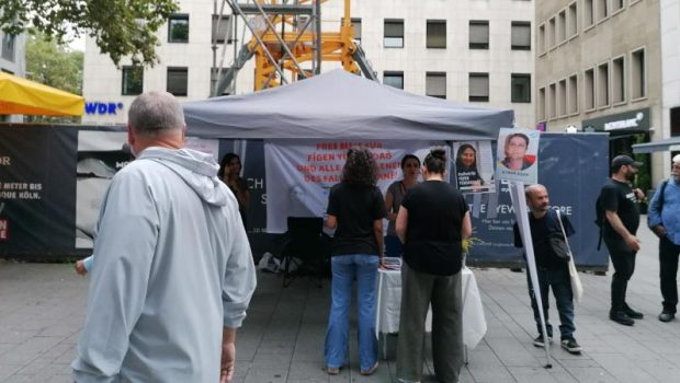 Figen Yüksekdağ ile Enternasyonal Kadın Dayanışma Ağı Köln’de stant açtı, Kobanê dava tutsaklarına özgürlük istedi.